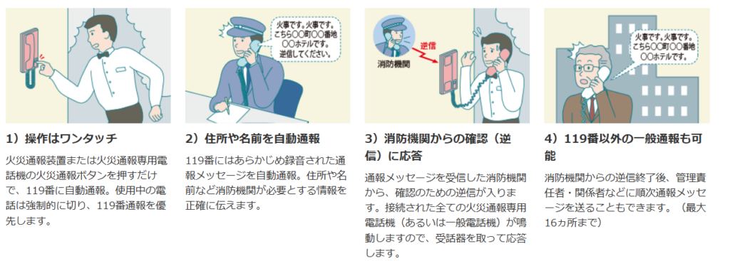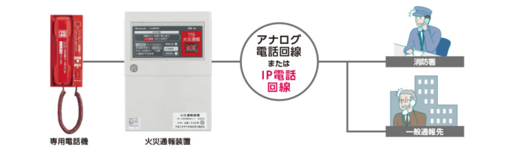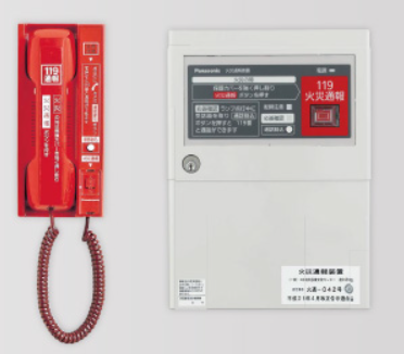 消防へワンタッチ又は、自動火災報知設備連動で119番通報をする装置です。