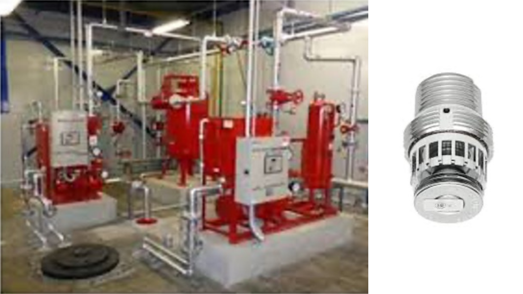 スプリンクラー設備は、防火対象物の天井部分等に配置されたスプリンクラーヘッド、壁面に設置された補助散水栓により、火災感知から放水を行い自動的に火災を消火する設備です。
